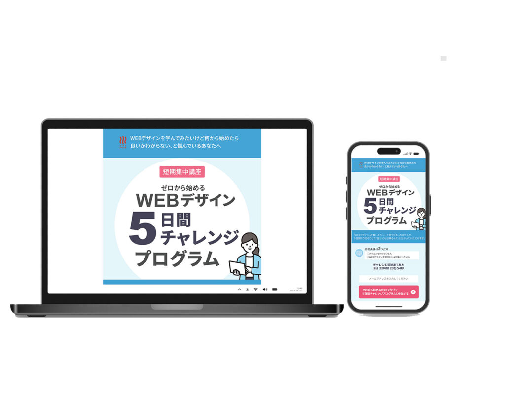 - WEBデザイン5日間チャレンジプログラムLP【工夫ポイント】 装飾を抑えたシンプルな構成をベースに、円形のモチーフを取り入れることで、 やさしく親しみやすい印象を意識したデザインとしました。 円はアイコンや装飾要素にも用い、 直線的になりすぎないことで、 女性向けのやわらかな可愛らしさを演出しています。 ライトブルーを基調にトーンを抑えて使用することで、 落ち着きと安心感を保ちながら、必要な情報が自然と伝わるよう、 視線の流れと情報整理を意識した構成としました。
