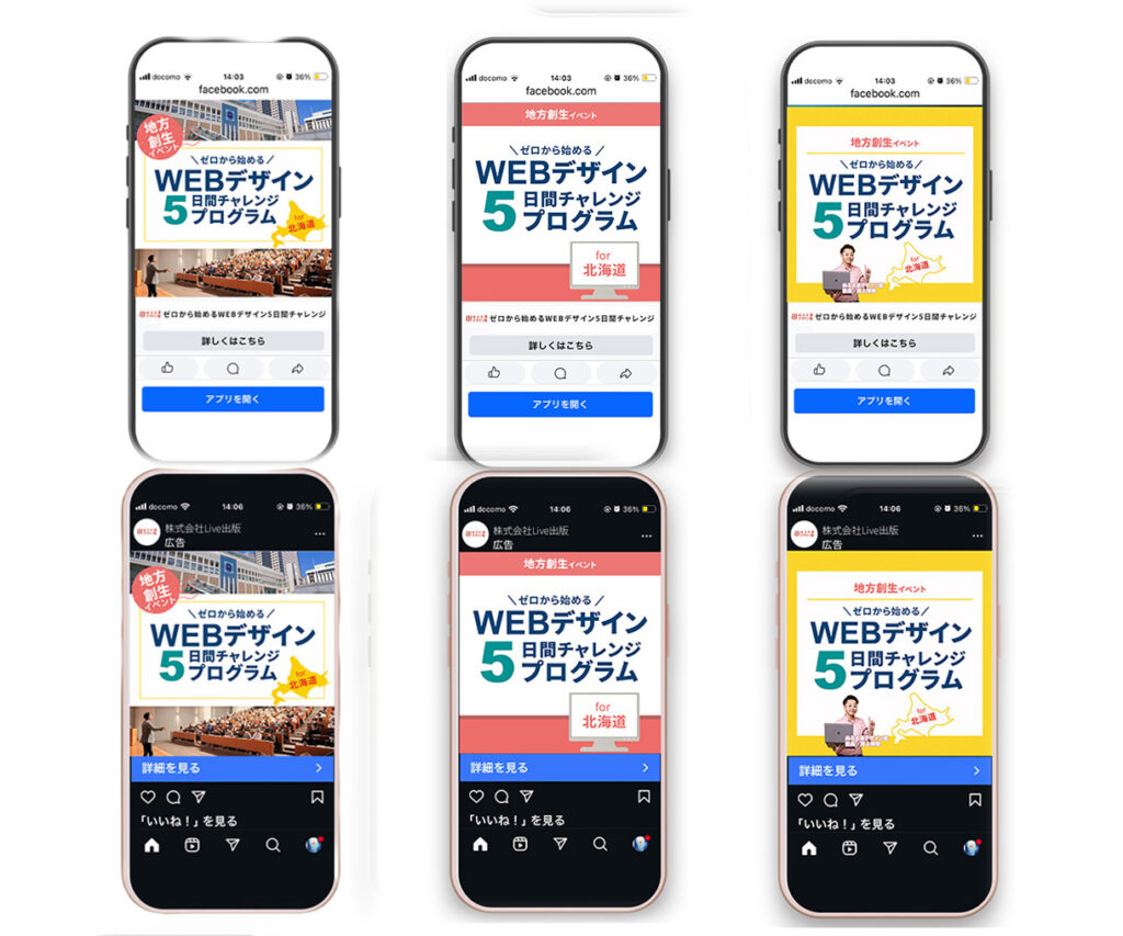 - WEBデザイン5日間チャレンジプログラムバナー【工夫ポイント】 「北海道民向け」という訴求が一目で伝わるよう、北海道の地図イラストを取り入れることで地域性を視覚的にも表現しました。 タイトルは文字の大きさや改行位置を調整し、まとまりのある文字組みにすることで視認性と印象の強さを高めています。 また、遷移先のLPと配色や世界観をそろえることで、クリック後も違和感のない一貫した印象になるよう工夫しました。