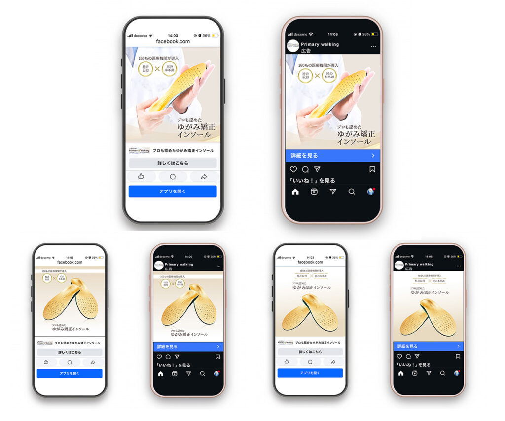 - ゆがみ矯正インソールバナー【工夫ポイント】 商品の品質の高さが伝わるよう、素材感や信頼感を意識したビジュアルと落ち着いた色味でデザインしました。 遷移先のLPと雰囲気や伝えたい内容をそろえることで、クリック後も違和感のない一貫した印象になるよう工夫しています。 また、商品の上質さを損なわないよう装飾を控えめにし、全体を上品なトーンでまとめました。